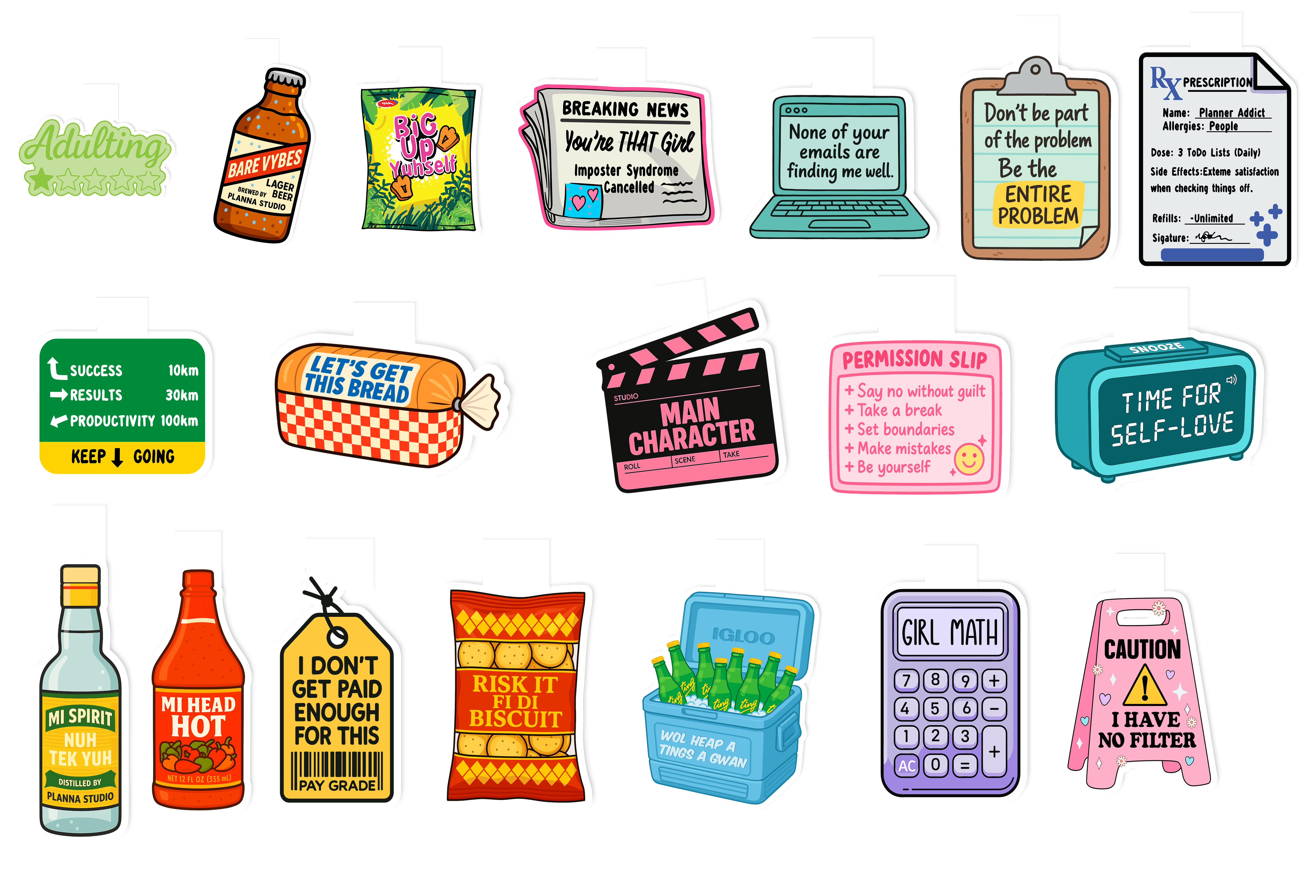 Adulting, Bare Vybes, Big up Yuhself, None of your emails, Prescription, Entire problem, Let's get this bread, Main Character, Mi head Hot, Pay grade, Mi spirit nuh tek yuh, Breaking News, Risk it fi di Biscuit, Keep going, Self love clock, Permission slip, Wol heap a tings a gwan, Girl Math, Caution, Stop light