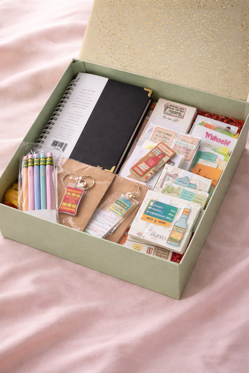 To support your daily flow, the box includes a dedicated meal planner to simplify weekly food prep and budgeting, a structured notepad for brain dumps and meeting notes, and a practical to-do list pad designed to keep your priorities visible and actionable.